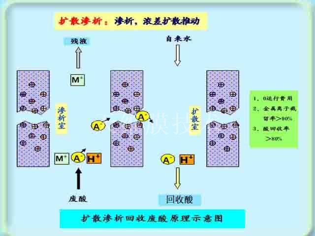 整個(gè)裝置是由一定數(shù)量的膜組成的一系列結(jié)構(gòu)單元;其中每個(gè)單元由一張陰離子均相膜隔開(kāi)成滲析室和擴(kuò)散室,采用逆流操作,在陰離子均相膜的兩側(cè)分別通入廢酸液及接受液(自來(lái)水)時(shí),廢酸液側(cè)的酸及其鹽的濃度遠(yuǎn)高于水的一側(cè),根據(jù)擴(kuò)散滲析原理,由于濃度梯度的存在,廢酸及其鹽類有向擴(kuò)散室滲透的趨勢(shì),但膜對(duì)陰離子具有選擇透過(guò)性,故在濃度差的作用下,廢酸側(cè)的陰離子被吸引而順利地透過(guò)膜孔道進(jìn)入水的一側(cè)。同時(shí)根據(jù)電中性要求,也會(huì)夾帶陽(yáng)離子,由于H+的水化半徑比較小,電荷較少;而金屬鹽的水化半徑較大,電荷較多,因此H+會(huì)優(yōu)先通過(guò)膜,這樣廢液中的酸就會(huì)被分離出來(lái)。